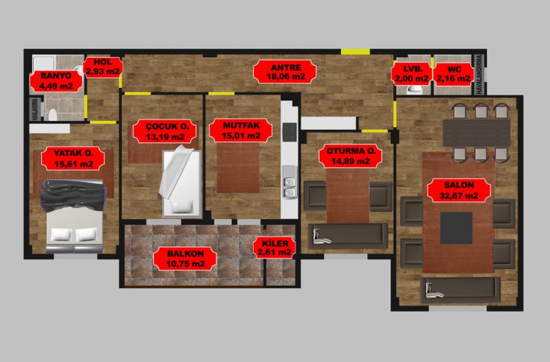 - Mutfak 15,01 m²